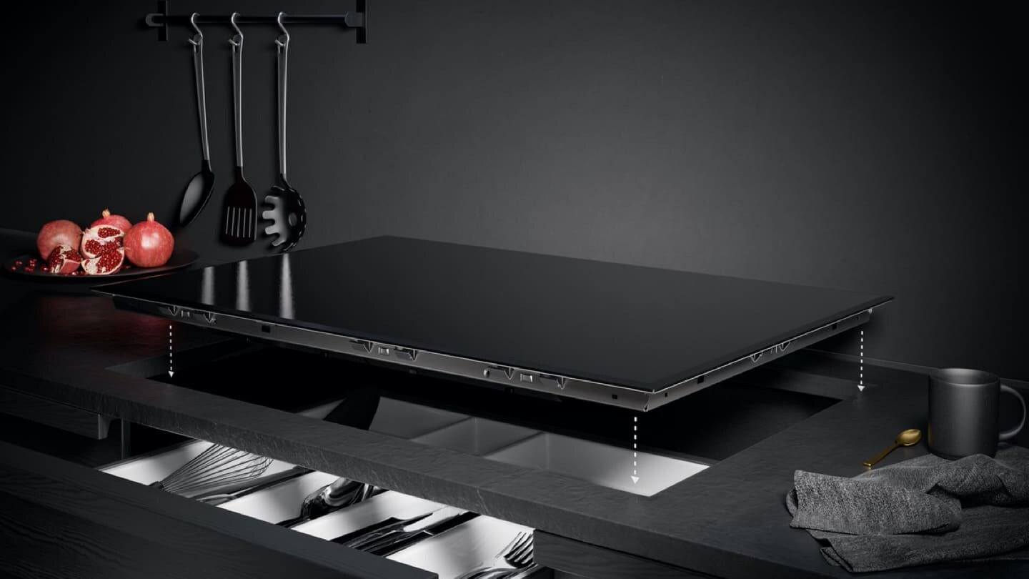 Wymiana płyty promiennikowej na płytę indukcyjną AEG jest bezproblemowa. Nie zniszczy Twoich mebli* i nie wymaga otworów wentylacyjnych. Ponieważ powietrze krąży pod płytą, można nawet mieć szufladę lub wbudowany bezpośrednio pod płytą grzejną piekarnik.