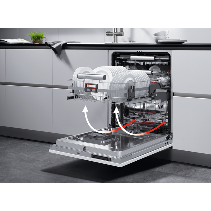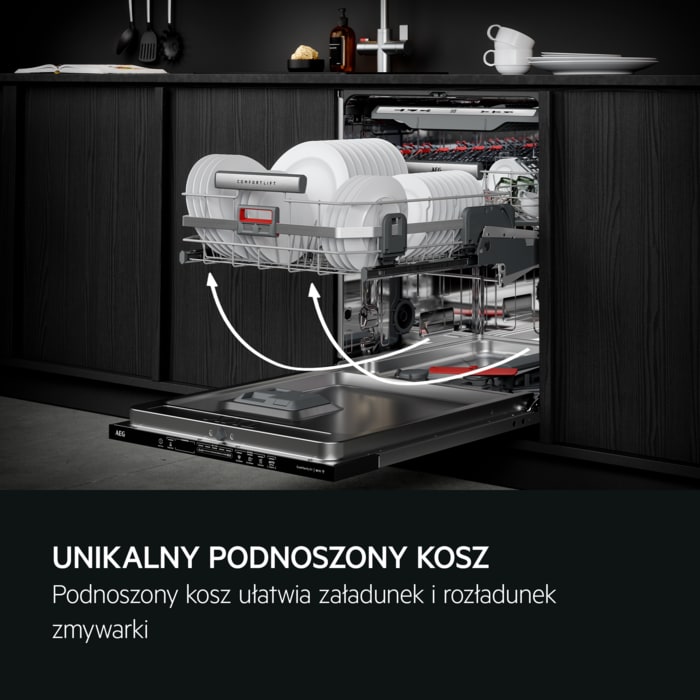 Zmywarka do zabudowy QuickSelect ComfortLift®, z unikalnym mechanizmem umożliwiajacym podnoszenie dolnego kosza, systemem SatelliteClean, który zapewnia doskonałe efekty zmywania, wyjmowalnym pojemnikiem na sztućce i wyświetlaczem Beam on floor.
