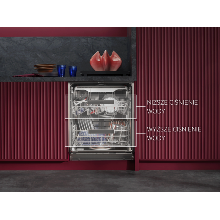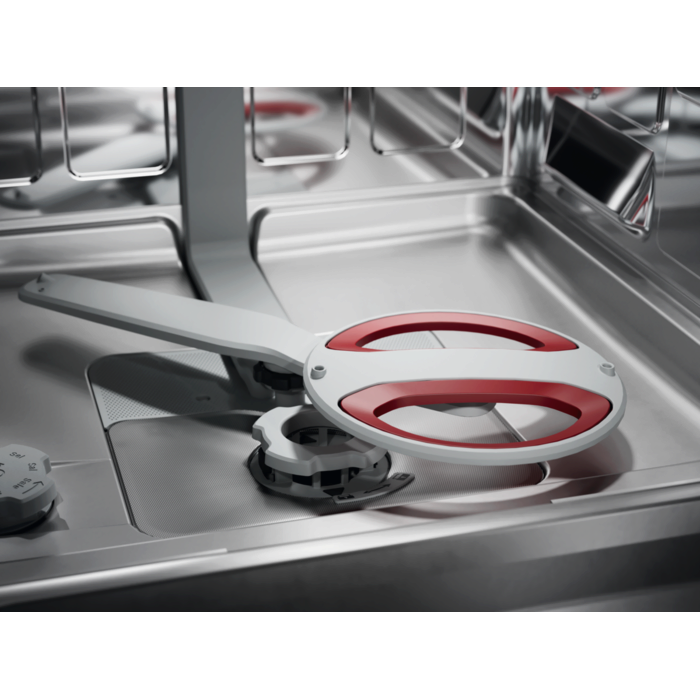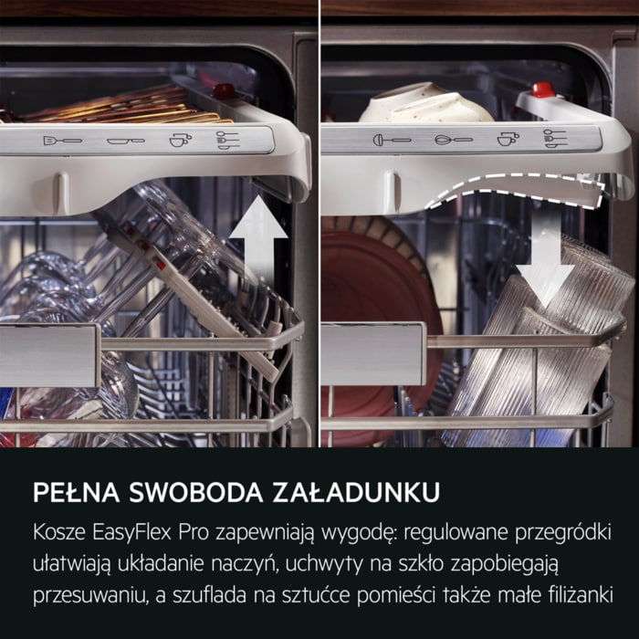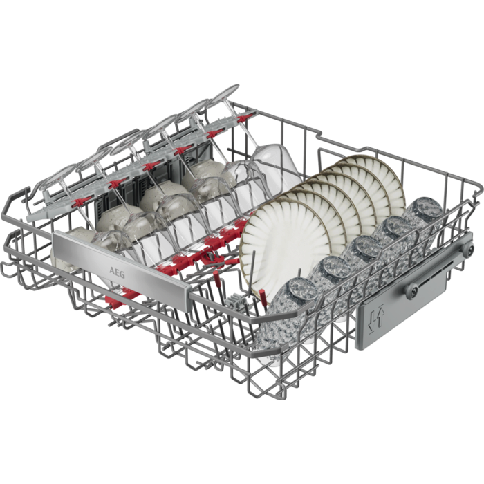 Zmywarka AEG z serii 9000 została wyposażona w wielofunkcyjne, wyjątkowo płynnie pracujące kosze oraz szuflady na sztućce, a także specjalne uchwyty na kieliszki i blachy do pieczenia. Zaawansowany system obiegu wody skutecznie usuwa nawet uporczywe zabrudzenia, jednocześnie zużywając jedynie 8,4 litra wody na cykl, co zapewnia wysoką efektywność i oszczędność.