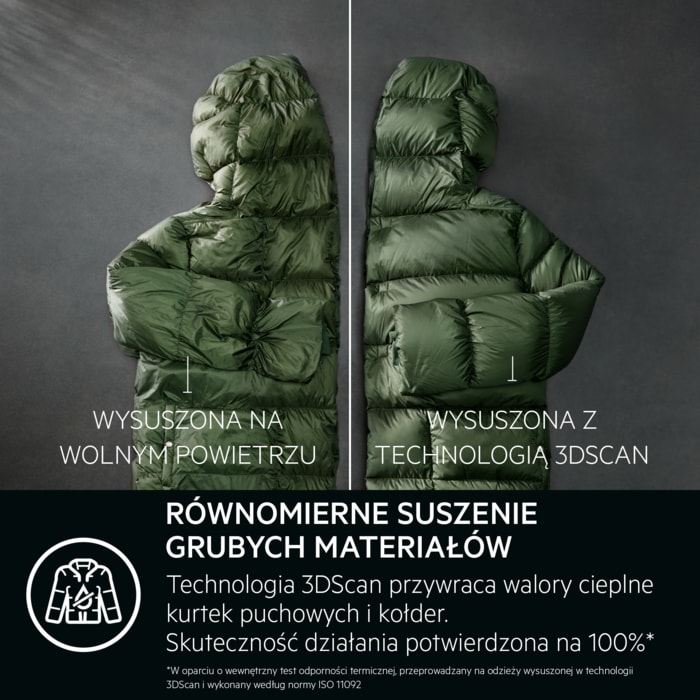 * Na podstawie zewnętrznego testu rezystancji termicznej dla prania osuszanego technologią 3DScan, przeprowadzonego zgodnie z ISO 11092.