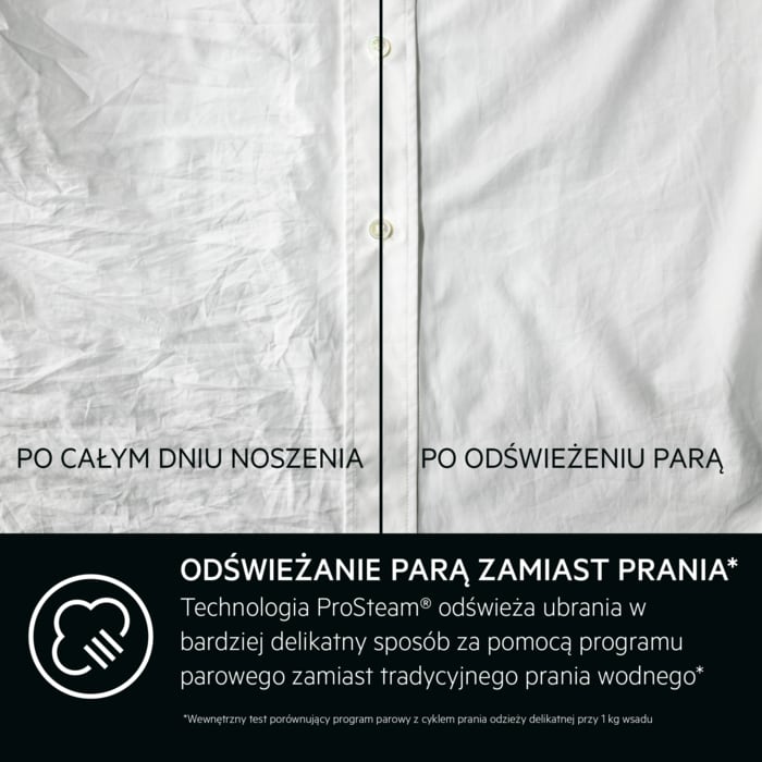Parowanie zamiast prania to jedna z najlepszych metod odświeżania ubrań, która nie wymaga pełnego cyklu prania. Pralka 7000 ProSteam® może używać cyklu parowania do odświeżania ubrań, zużywając jedynie 2 l wody na cykl i delikatniej obchodząc się z ubraniami.