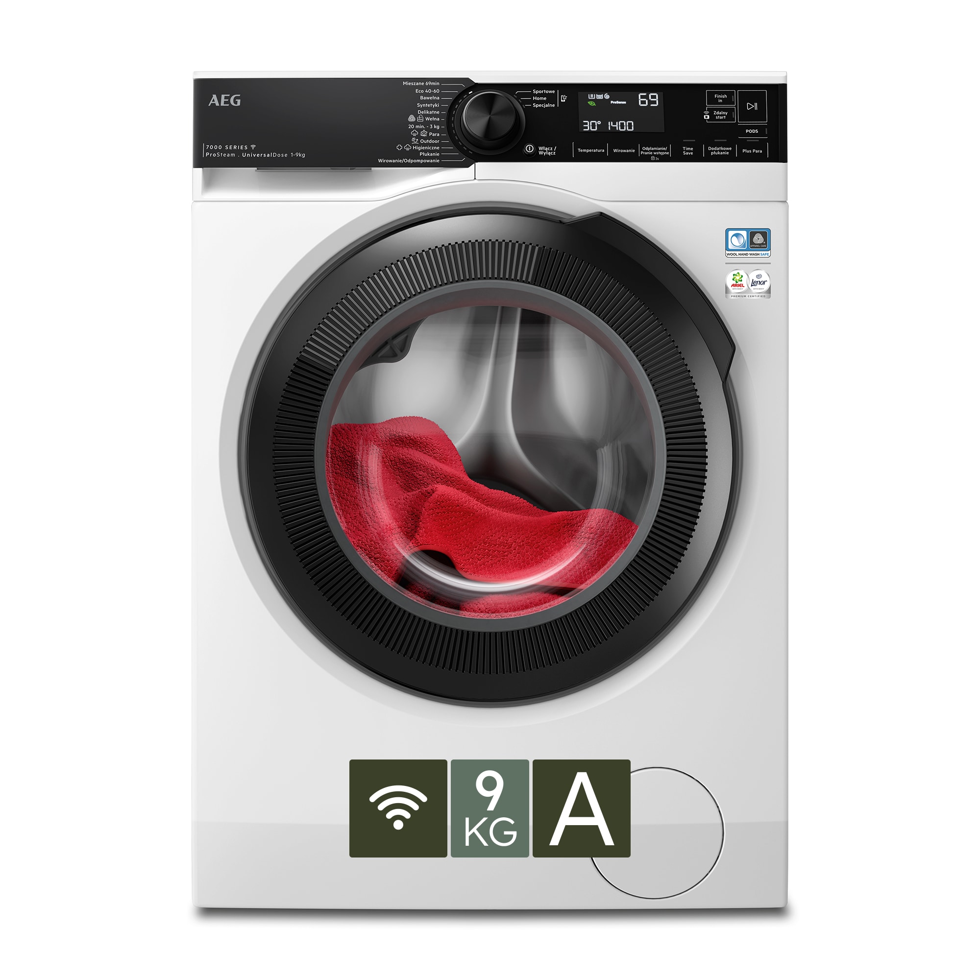 Pralka ładowana od frontu ProSteam® z programem MixLoad 69 min, szufladą UniversalDose i opcją zdalnego sterowania za pomocą aplikacji AEG, pojemność 9 kg.